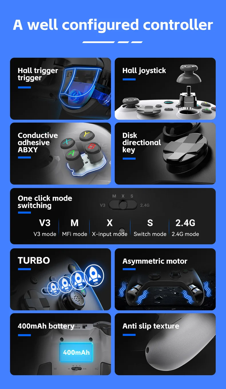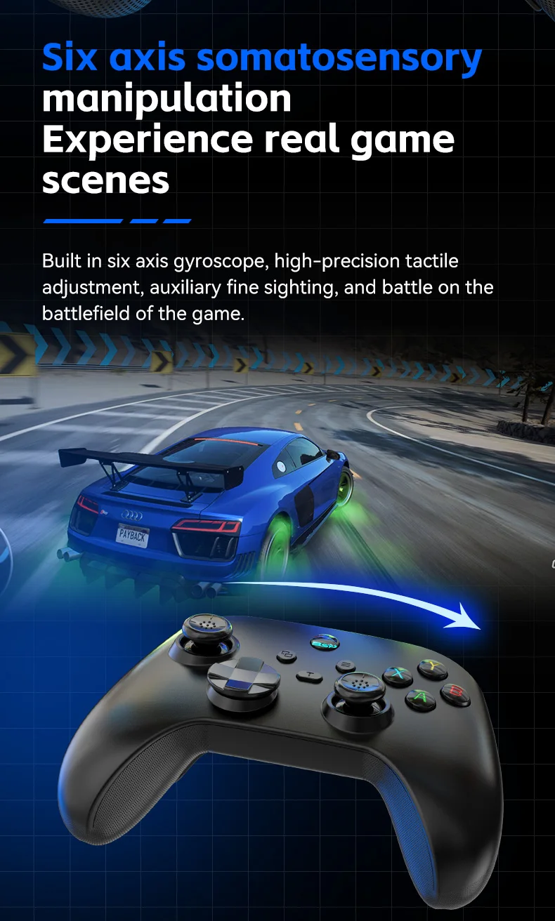 3. Gyroscope six axes avec détection de mouvement, touche arrière avec macro programmable, double moteur de vibration ajustable, fonction TURBO à une touche. 4. Boutons ABXY à membrane conductrice, excellente sensation d'appui ; Croix directionnelle de type disque, fluide comme un joystick ; Poignée avec texture antidérapante pour une prise ferme en pleine bataille.